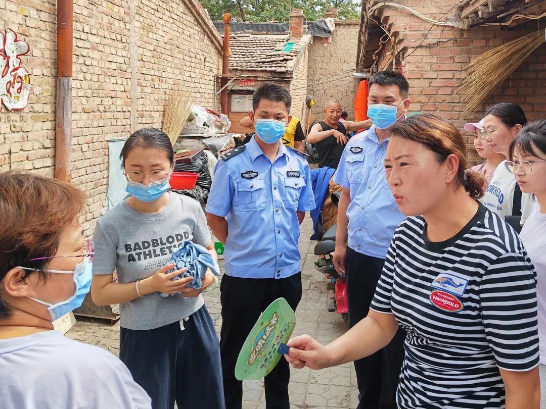贾超(左三)和张宇(左四)两位同志正在与社区工作人员共同开展防汛预警工作。